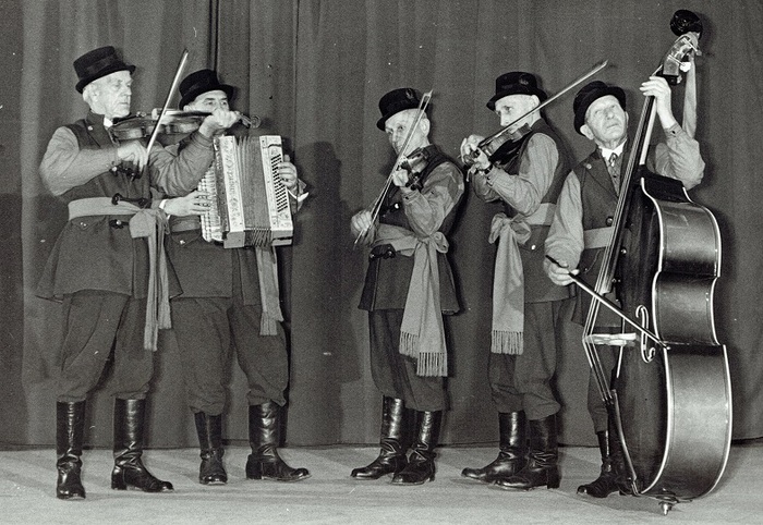 Muzycy z "Kapeli Spod Kowala" na fotografii z ok. 1972 roku. Od lewej: Franciszek Skrzypiński (skrzypce), Józef Pietrzak (akordeon), Józef Strzelecki (skrzypce), Jan Ambrożewicz (skrzypce), Szczepan Strzelecki (bas). | |