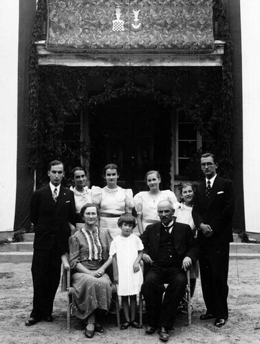 Srebrne Wesele w Dębsku w czerwcu 1937 r. zdjęcie Marii i Antoniego Piątkowskich z wszystkimi dziećmi (od lewej): Jan, Bronisława, Krystyna, Natalia, Teresa, Stanisław i – pomiędzy rodzicami – Marysia. | |