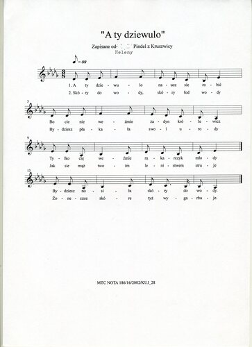 "A ty dziewulo" piosenka kujawska zapisana w 1999 roku od Heleny Pindel z Kruszwicy. Zanotowała Wanda Szkulmowska (oprac nutowe. Marian Wiśniewski). | |