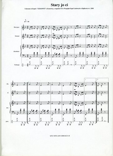 Stary jo ci - kujawiak zasłyszany od kapeli "Ziemowit z Kruszwicy" podczas przeglądu w Bądkowie w 2000 roku. Zapisany przez Wandę Szkulmowską (opracowanie nut Marian Wiśniewski). | |