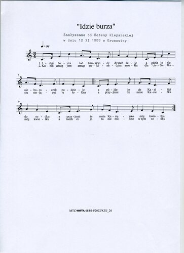 Idzie burza - śpiew kujawski zasłyszany od Bożeny Kleparskiej w Kruszwicy. Zapisany prez Wandę Szkulmowską (opracowanie nut Marian Wiśniewski). | |