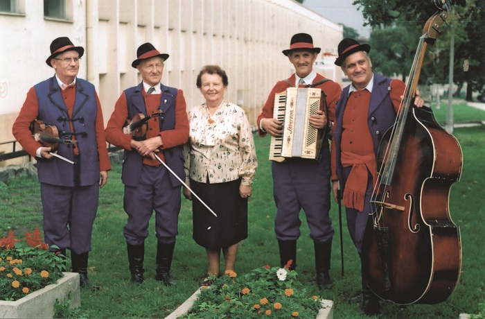 Kapela zespołu regionalnego "Kujawy" ze Sławska Wielkiego rok 1995. Stoją od lewej: Stanisław Daniel (skrzypce), Walenty wiśniewski (skrzypce), Maria Patyk (śpiewaczka, kierownik zespołu), Henryk Nawrocki (akordeon), Czesław Wiśniewski (basy). (fot. Jan Szkulmowski). | |