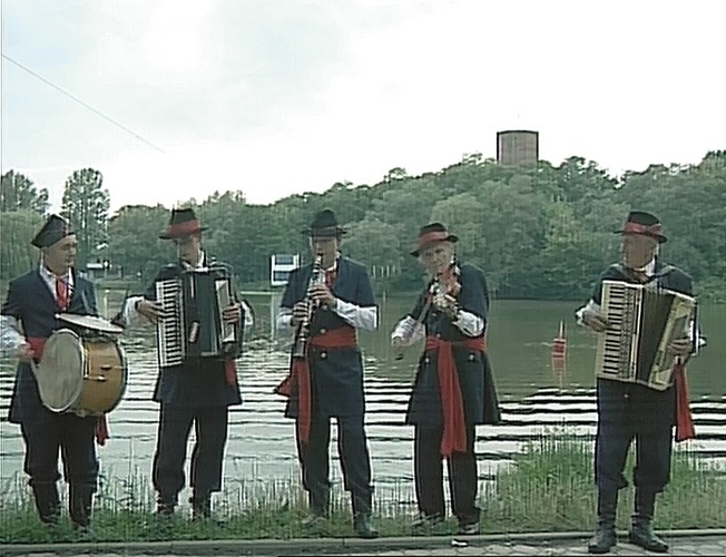 Kapela Zespołu Nadgoplańskiego z Kruszwicy w składzie: Zenon Czajkowski (bęben), Grzegorz Wojciechowski (akordeon), Henryk Olejnik (klarnet), Kazimierz Zieliński (skrzypce), Jerzy Myśliwy akordeon). Zdjęcie z roku 1998 (fot. Wanda Szkulmowska). | |