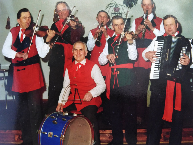 Marzec 1991 był bardzo aktywnym rokiem dla kapeli "Kujawioki". Jedną z aktywności był koncert w sanatorium w Wieńcu. Kuracjusze, według relacji, byli zachwyceni i wzruszeni występem. Na zdjęciu od lewej: Spychalski, Bolesław Głowacki, Aleksander Jarzębiński, Jan Głowacki, Zbigniew Urbański, Ireneusz Skiczak i Zenon Paliwoda. | |