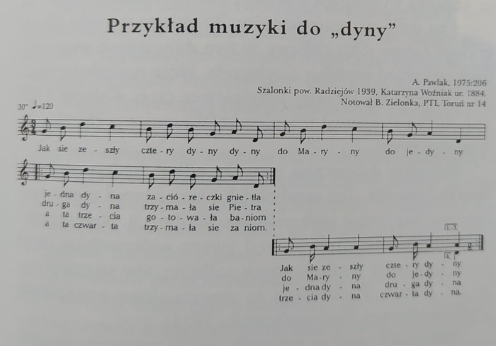 Przykład muzyki do "dyny" (nuty) A. Pawlak, 1975:206 Szalonki, pow. Radziejów 1939, Katarzyna Woźniak, ur. 1884. Notował B. Zielonka, PTL Toruń nr 14. | |