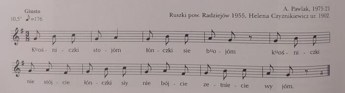 "Kośniczki stojóm łónczki sie bojóm" (nuty) 1955 A. Pawlak, 1975: 21 Ruszki, pow. Radziejów 1955, Helena Czyżnikiewicz ur. 1902. | |