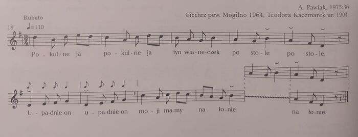 "Pokulne ja pokulne ja tyn wianeczek" (nuty) 1964 A. Pawlak, 1975: 36 Ciechrz pow. Mogilno 1964, Teodora Kaczmarek ur. 1904 | |