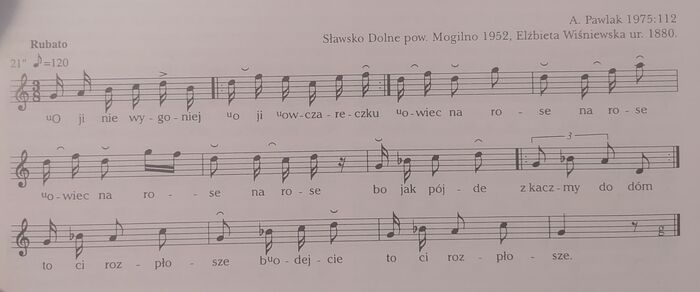 "O ji nie wygodniej o ji owczareczku" (nuty) 1952 A. Pawlak, 1975: 112 Sławsko Dolne pow. Mogilno 1952, Elżbieta Wiśniewska ur. 1880. | |
