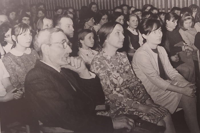 Koncert poezji F. Becińskiego w Muzeum Entograficznym w Toruniu. Siedzą od lewej: autor, Wanda Szkulmowska i Ewa Arszyńska, 1972. | |